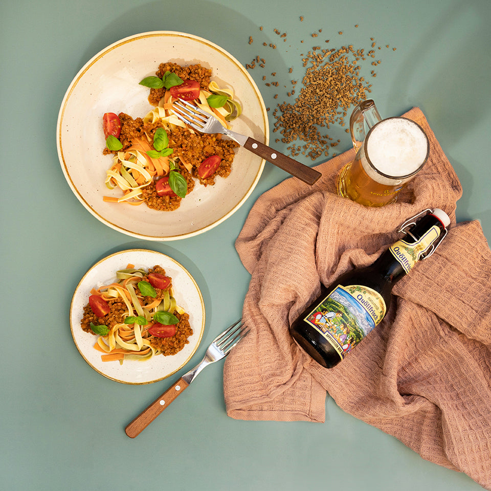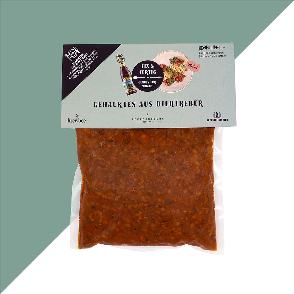 Hergestellt im Rahmen der Kreislaufwirtschaft, nutzen wir Biertreber – ein wertvolles Nebenprodukt der Bierproduktion der Brauerei Locher – und verwandeln es in ein delikates, veganes Gehacktes, das in Geschmack und Vielseitigkeit überzeugt. Mit seiner fleischähnlichen Textur und dem herzhaften Aroma ist es die perfekte Basis für zahlreiche Gerichte. Verwenden Sie es in klassischen Rezepten wie Gehacktes & Hörnli, Lasagne oder Bolognese, oder lassen Sie Ihrer Kreativität freien Lauf und füllen Sie Paprika, Fajitas und vieles mehr.